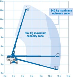 Med en maksimal arbejdshøjde på 20,3 meter og en horisontal rækkevidde på 15,50 meter tilbyder GENIE S60 HC et fleksibelt og effektivt arbejdsområde. Den høje platformkapacitet på op til 567 kg gør liften ideel til opgaver, hvor der arbejdes med flere personer, tungt værktøj eller materialer.