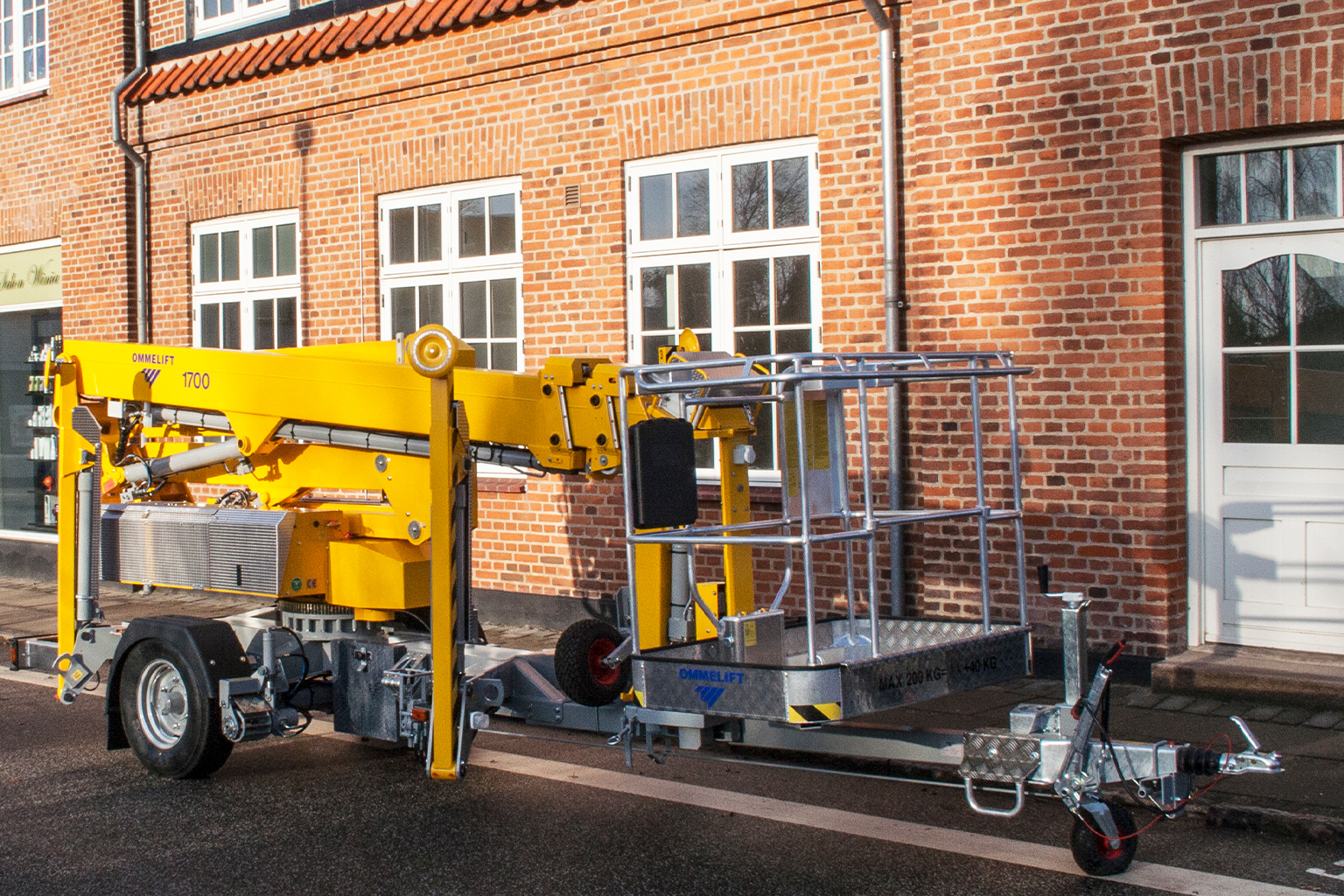 Betjeningen er enkel og overskuelig med styrebokse placeret både i kurven og ved tårnet. De hydrauliske støtteben betjenes centralt fra undervognen, hvilket sikrer effektiv og sikker klargøring.